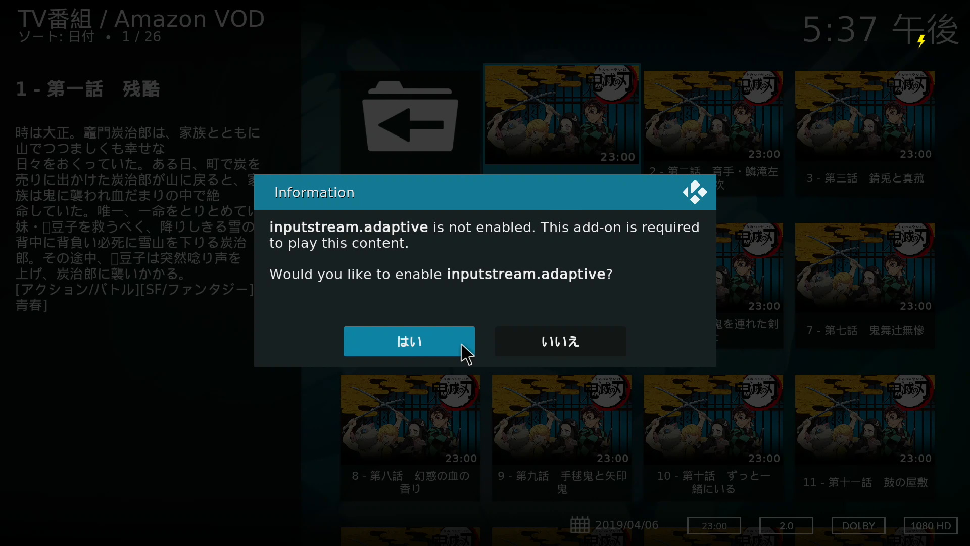 ここで、「inputstream.avaptive」を有効にする必要があるメッセージが表示されますので「はい」を選択します。